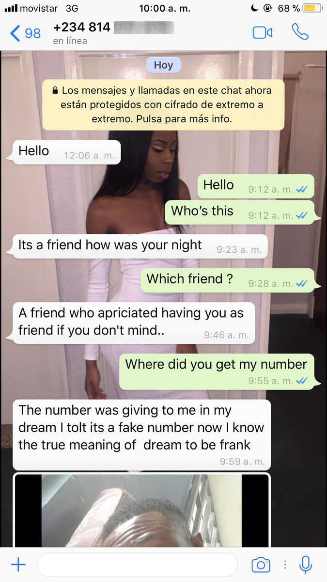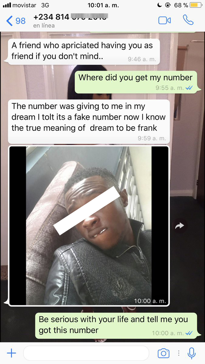 A Spanish lady has taken to social media to expose a Nigerian guy who strangely hit her up on Whatsapp and when she asked him how he got her number, he responded pathetically.