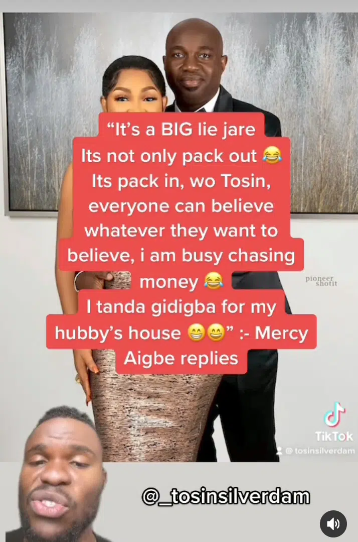 “It’s a BIG lie jare, It’s not only pack out is pack in, wo Tosin, everyone can believe whatever they want to believe, I am busy chasing money. I tanda gidigba for my bubby’s house”. Tosin quoted her as saying.
