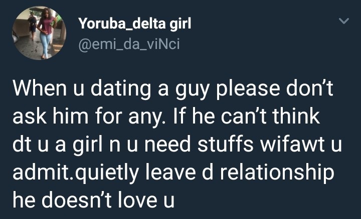 A Nigerian Lady on twitter is of the opinion that oral confession of love is not enough and she’s advising women to avoid men who can’t invest in them.