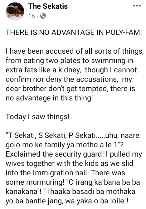 Today I saw things! “T Sekati, S Sekati, P Sekati…..uhu, naare golo mo ke family ya motho a le 1”? Exclaimed the security guard! I pulled my wives together with the kids as we slid into the Immigration hall! There was some murmuring! “O irang ka bana ba ba kanakana”! “Thaaka basadi ba mothaka yo ba bantle jang, wa yaka o ba loile”!