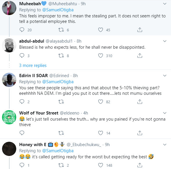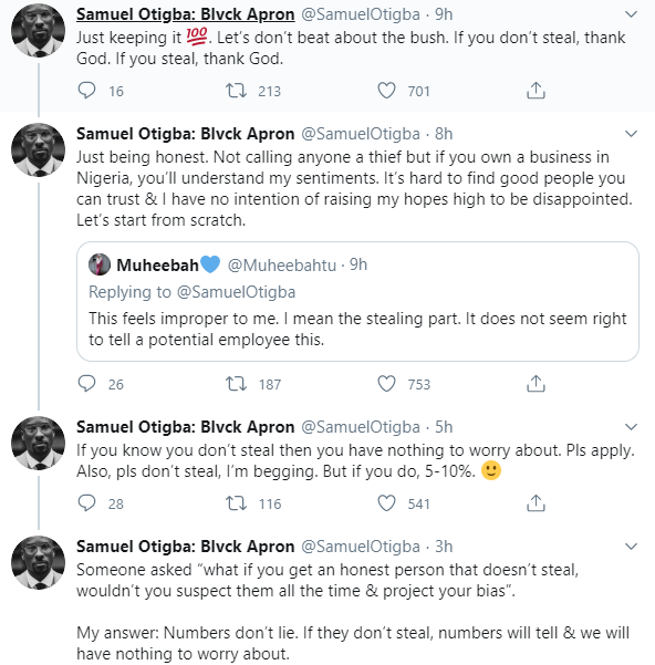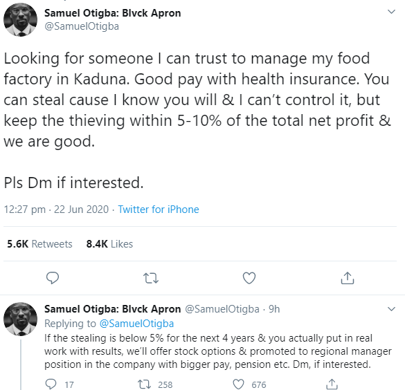 “Looking for someone I can trust to manage my food factory in Kaduna. Good pay with health insurance. You can steal cause I know you will & I can’t control it, but keep the thieving within 5-10% of the total net profit & we are good.”