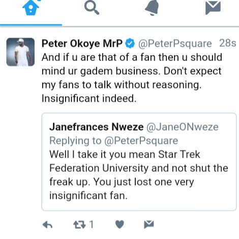 The P-square half was live in England to celebrate Chelsea on their Premier League victory on Friday – a fan then took to twitter to call on Peter‘s support for Nigerian football competitions, but apparently, the singer was not in the same light with the fan.
