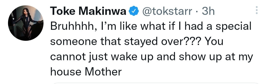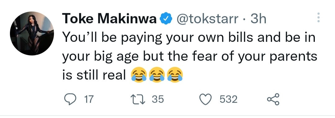 Nigerian media personality, Toke Makinwa took to her Twitter page recently to share despite her age, she still fears her mother.