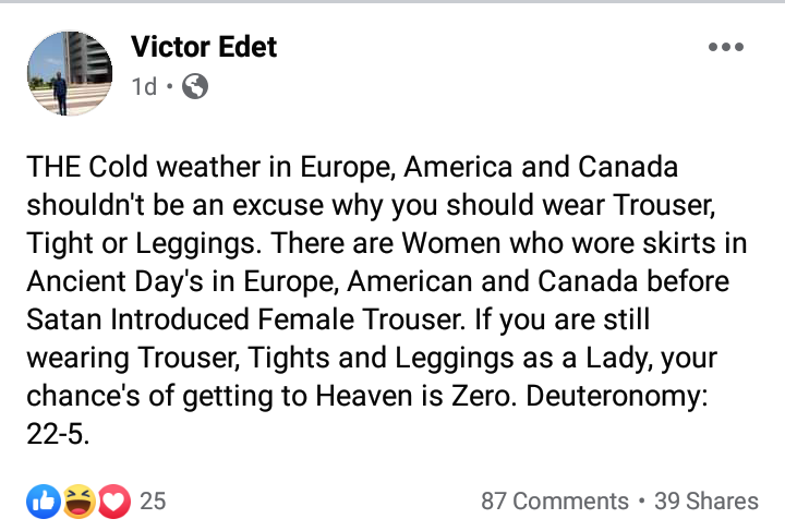 “THE Cold weather in Europe, America and Canada shouldn’t be an excuse why you should wear Trouser, Tight or Leggings. There are Women who wore skirts in Ancient Day’s in Europe, American and Canada before Satan Introduced Female Trouser. If you are still wearing Trouser, Tights and Leggings as a Lady, your chance’s of getting to Heaven is Zero. Deuteronomy:22-5”