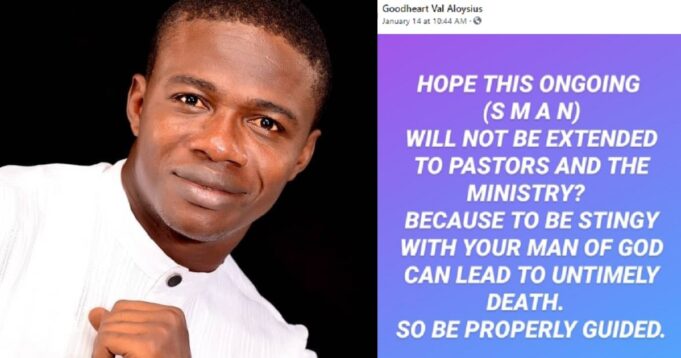 “Hope this ongoing (SMAN) will not be extended to pastors and the ministry? Because to be stingy with your man of God can lead to untimely death. So be properly guided”.