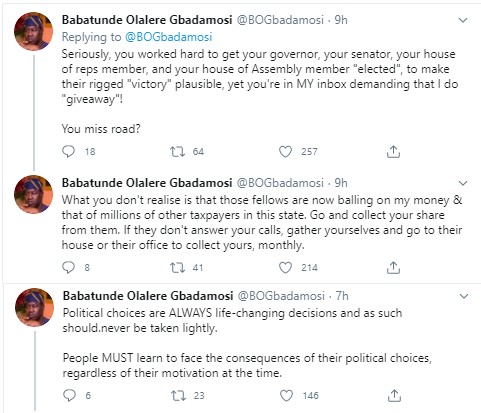 Gbadamosi took to his Twitter handle to issue the stern warning and told those asking him to do giveaways, to take their financial problems to the current leaders they voted for.