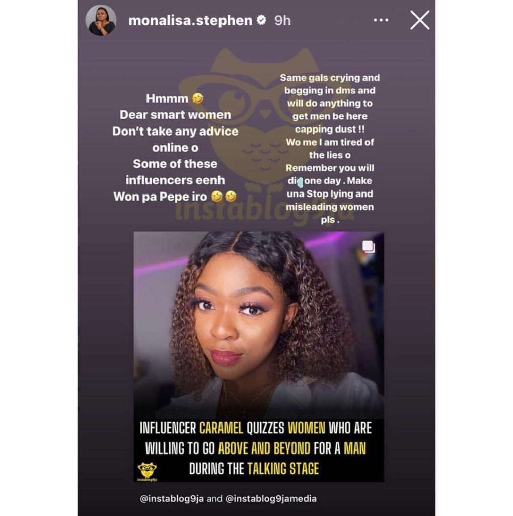 Reacting to Caramel’s post, Monalisa chided her for misleading women on social media, when she knows fully welly that she can go above and beyond to get a man.