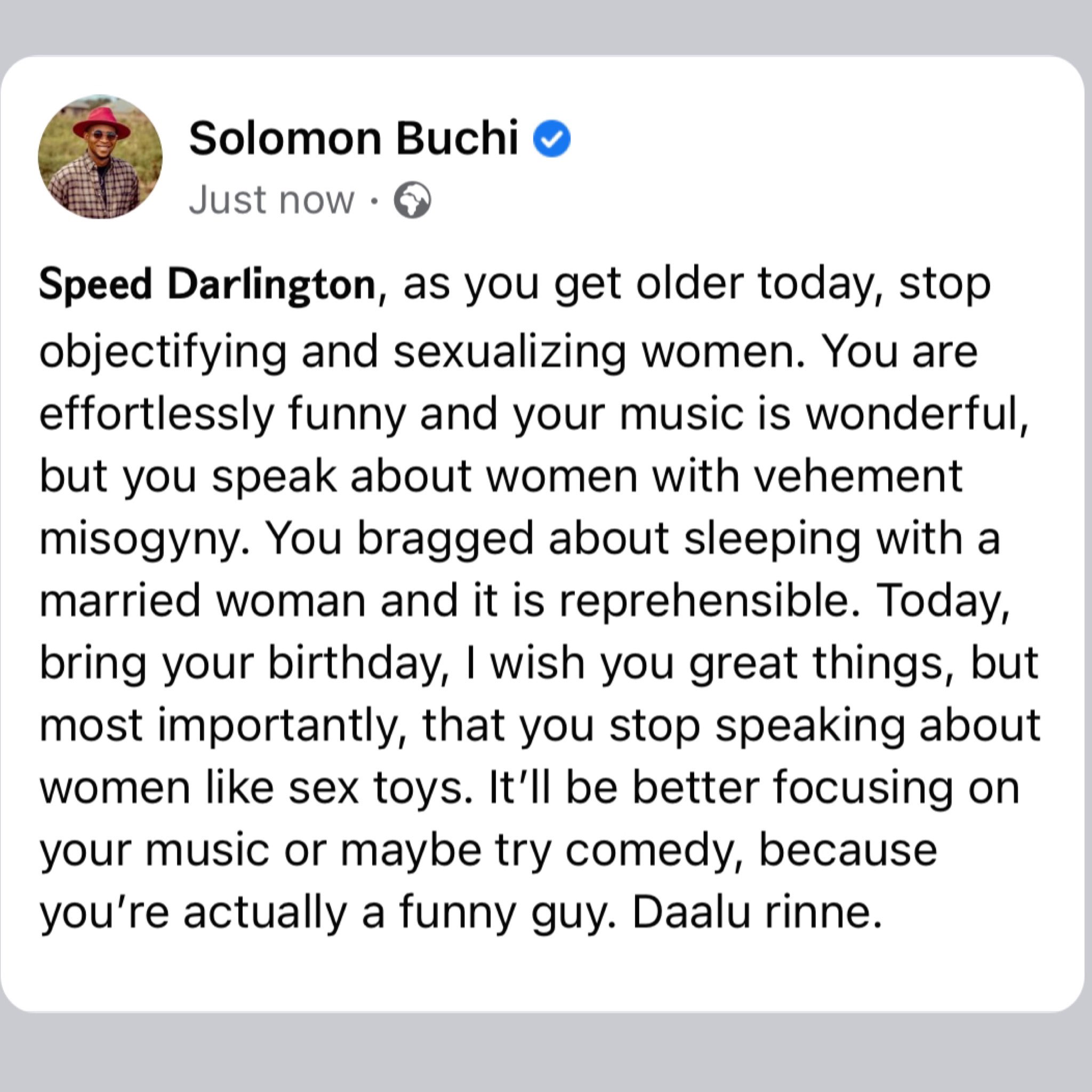 “𝗦𝗽𝗲𝗲𝗱 𝗗𝗮𝗿𝗹𝗶𝗻𝗴𝘁𝗼𝗻, as you get older today, please stop objectifying and sexualizing women. You are effortlessly funny and your music is wonderful, but you speak about women with vehement misogyny. You bragged about sleeping with a married woman and it is reprehensible. Today, being your birthday, I wish you great things, but most importantly, that you stop speaking about women like sex toys. It’ll be better to focus on your music or maybe try comedy because you’re a funny guy. Daalu rinne.”