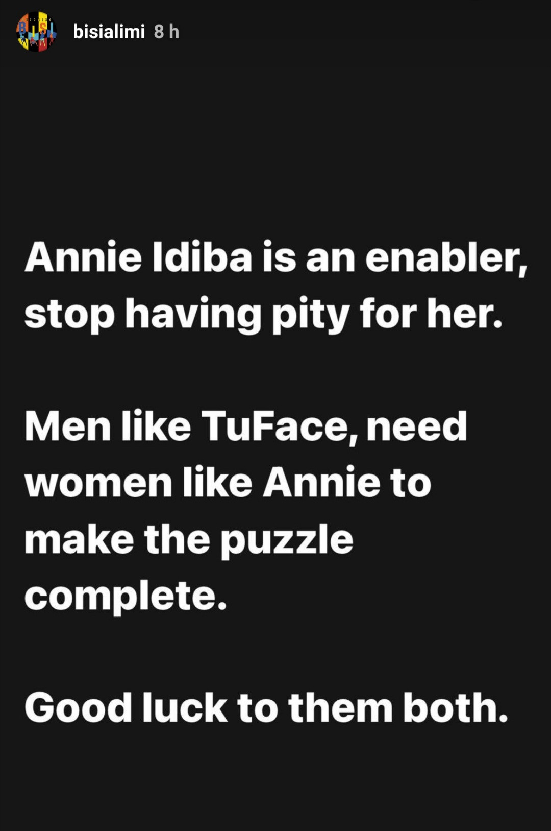 “Annie Idibia is an enabler, stop having pity for her. Men like Tuface, need women like Annie to make the puzzle complete. Good luck to them both”.