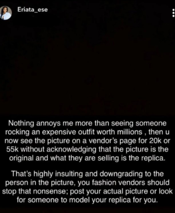 Ese, in a post shared on Snapchat, said she finds it annoying when an online vendor who sells fake designer outfits uses a picture of someone wearing the original and expensive version of the cloth to advertise their wares.