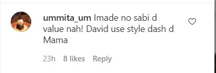 @ummita_um wrote, “Imade no sabi d value nah! David use style dash d Mama”.
