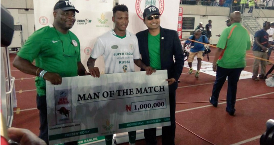 Shehu Abdullahi, Super Eagles Right back, has been awarded with N1 million and 10 Bags of Rice, after he was voted “Man of the Match”.