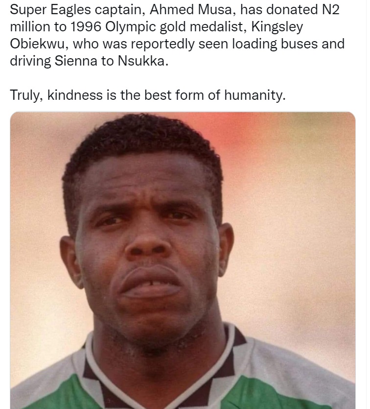 Super Eagles captain Ahmed Musa has donated two million naira to former international footballer Kingsley Obiekwu