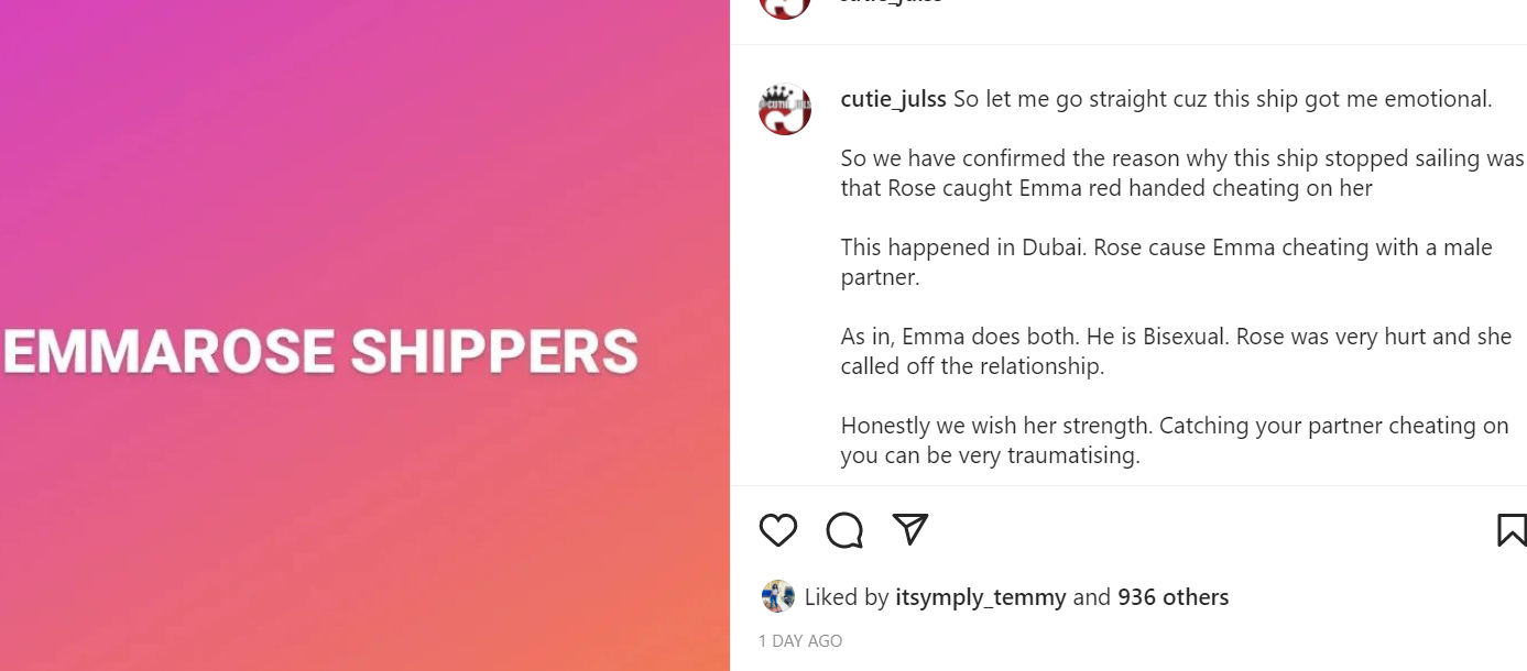 So we have confirmed the reason why this ship stopped sailing was that Rose caught Emma red handed cheating on her.
