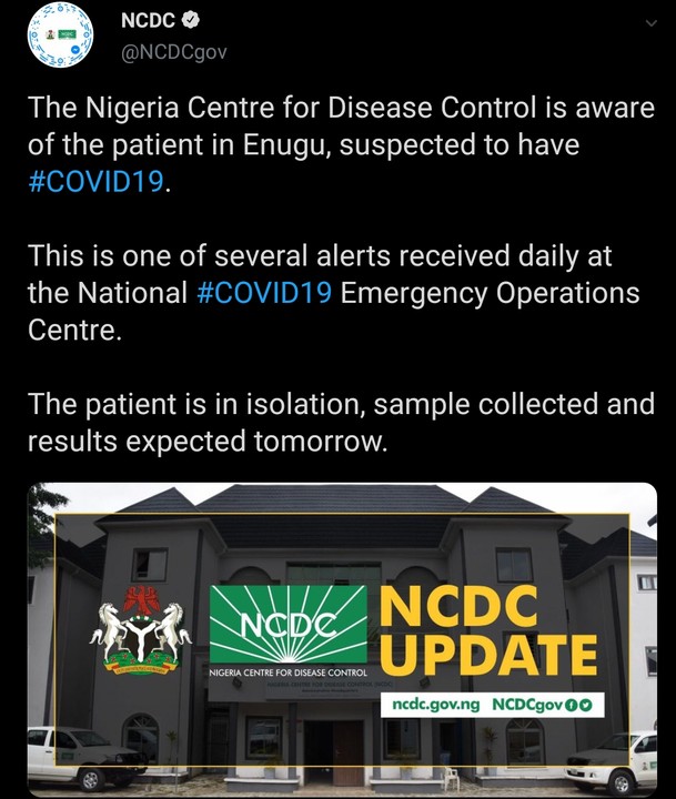 Giving the update in a tweet, the Nigeria Centre for Disease Control, NCDC, stated: “The Nigeria Centre for Disease Control is aware of the patient in Enugu, suspected to have COVID-19.
