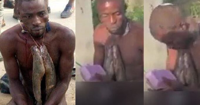 The man confessed to stealing fish from a pond, according to a Facebook user who shared the footage showing the suspect devouring the food after being beaten by the vigilantes.