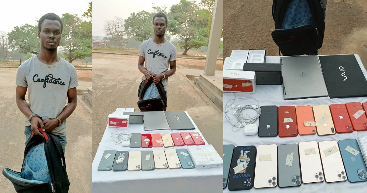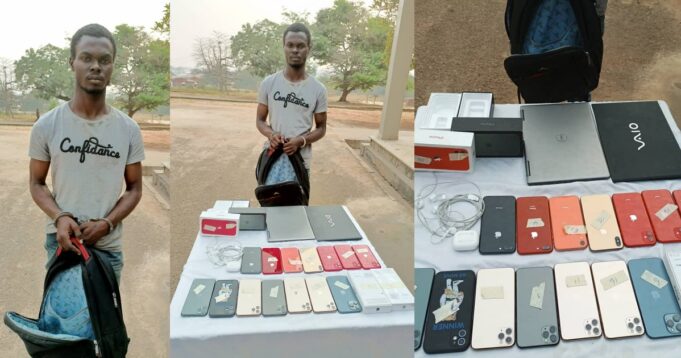 Policemen of Felele Divisional Headquarters of Oyo State Command on Saturday January 22nd, arrested a 23-year-old man identified as Awoola Tobi, of Oleyo Ayegun road Ibadan, who is reported to be a habitual burglar in connection with a case of Burglary and Stealing which occurred at about 2000hrs on Thursday 28/12/2021 at Choice Plaza, Challenge area Ibadan were mobile phones and accessories to the tune of about (#2,000,000) two million naira were allegedly stolen.