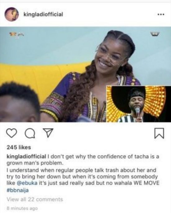 Her reported boyfriend, Ladi, has now come in support of her. Ladi took to Instagram to question why Tacha’s confidence gives people ‘headache’ and emphasize on how Ebuka, the host is not helping the matter also.