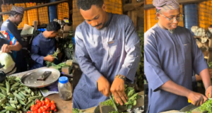 Man and his friend compete over cutting vegetables after visiting his...