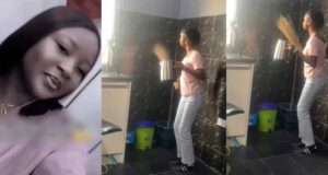 Woman surprised after finding her colleague dancing before a camera in...