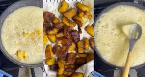 Nigerian chef lamǝnts over oil foaming while frying plantain ‘dodo’ for...