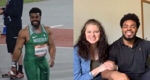 Nigeria’s Olympic shotput thrower, Chuks Enekwechi’s sister, reacts after someone dragged...