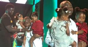 Davido brings his 2 daughters Imade and Hailey on stage during...