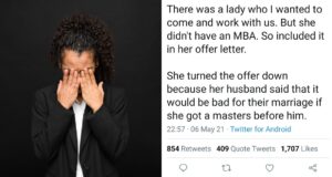 Woman refuses a job offer because her husband said it will...
