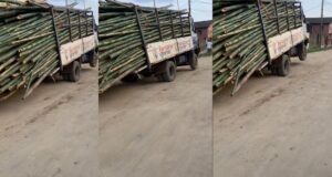 Passersby Flee As Overloaded Truck With Bamboo Poles Jiggles On The...