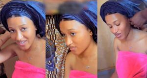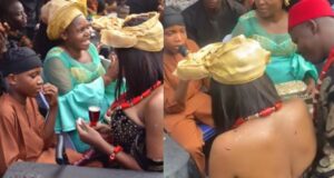 Nigerian mum tries to cover her daughter’s cleavage as she blesses...