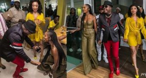 Sir Shina Peters reacts after Tiwa Savage knelt down to greet...