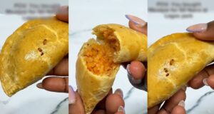 “Smokey jollof pie” – Confusion as Lady discovers jollof rice filling...