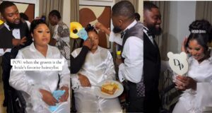 Netizens amazed as groom styles wife’s hair on their wedding day...