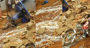 Outr@ge as “okada” man ran into a tricycle conveying crates of...