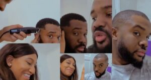 Actor, Williams Uchemba lets his wife, Brunella cut his hair after...