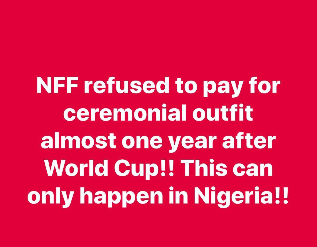 NFF refused to pay for ceremonial outfit almost one year after World Cup!! This can only happen in Nigeria. My brother Amaju has stopped picking my calls cos of money. Someone at the office told me the court is my only option. What a shame.