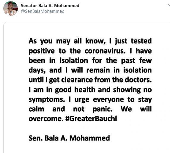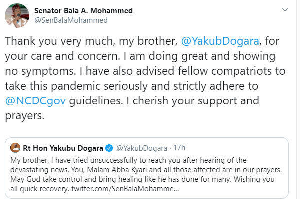 I am doing great and showing no symptoms. I have also advised fellow compatriots to take this pandemic seriously and strictly adhere to @NCDCgov guidelines. I cherish your support and prayers.