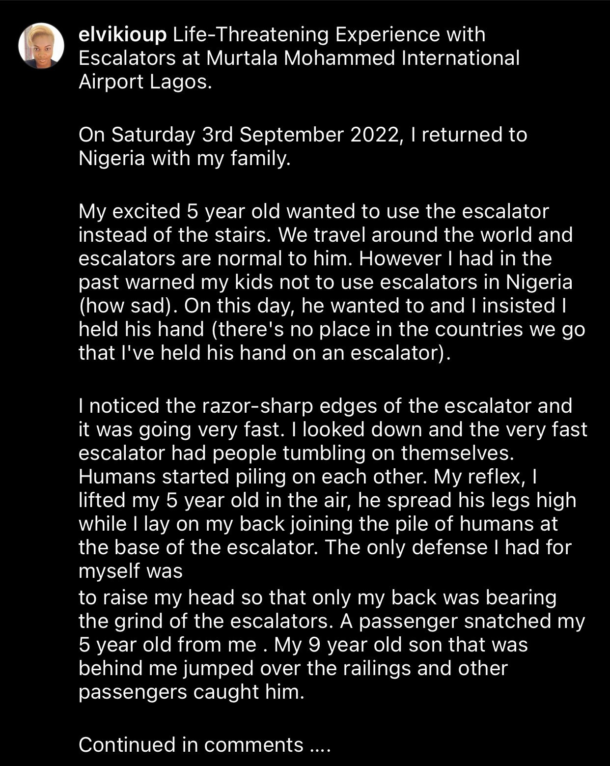 “On Saturday 3rd September 2022, I returned to Nigeria with my family. My excited 5 year old wanted to use the escalator instead of the stairs. We travel around the world and escalators are normal to him. However, in the past I’d warned my kids not to use escalators in Nigeria (how sad). On this day, he wanted to and I insisted I hold his hand (there’s no place in the world we go that I’ve held his hand on an escalator)…