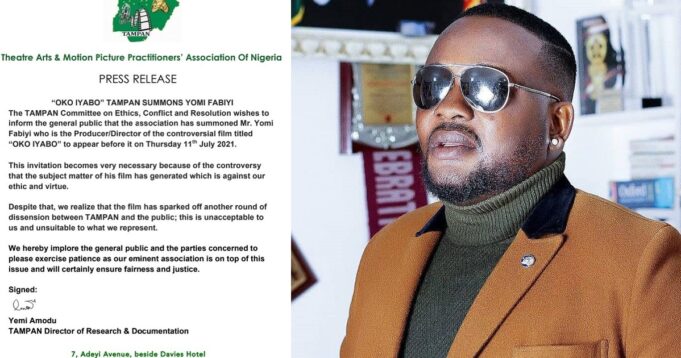“The TAMPAN Committee on Ethics, Conflict and Resolution wishes to inform the general public that the association has summoned Mr. Yomi Fabiyi who is the Producer/Director of the controversial film titled “OKO IYABO” to appear before it on Thursday 11th July 2021.