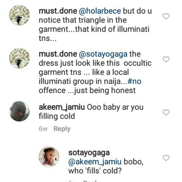 Beautiful Nigerian actress, Tayo Sobola shared photos of herself rocking a controversial outfit on her Instagram, and fans are accusing her the outfit contains some weird occult symbols.
