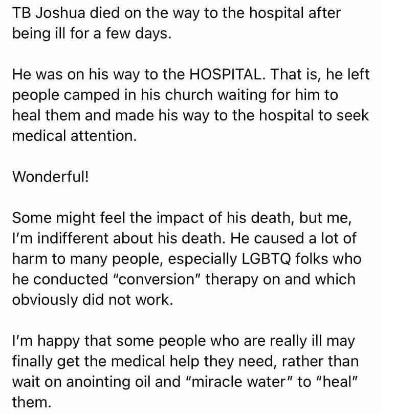 In a Facebook post she shared, Adie said she is indifferent about it because according to her, TB Joshua ’caused a lot of harm to many people especially LGBTQ folks who he conducted ‘conversion’ therapy on, which she also claimed never worked.’