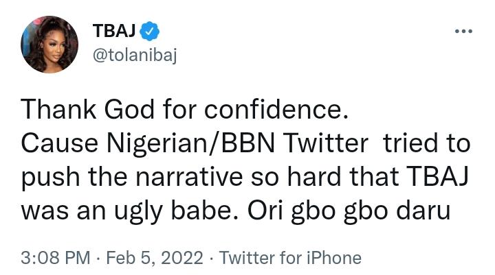 In a follow-up tweet, she wrote “Cause Nigerian/BBN Twitter tried to push the narrative so hard that TBAJ was an ugly babe. Ori gbo gbo daru.”