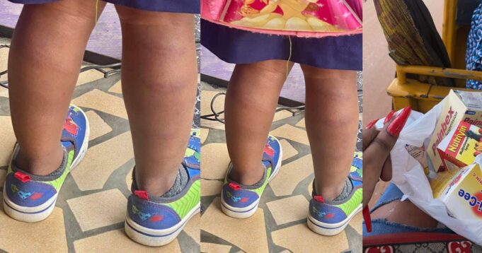 Twitter user @nwaadaigbo1, who shared photos of the Toddler’s bruised calves, wrote ;