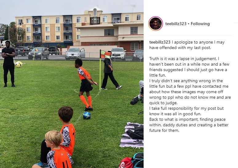 ”I apologize to anyone I may have offended with my last post. Truth is, it was a lapse in judgement. I haven’t been out in a while now and a few friends suggested I should just go have a little fun. I truly didn’t see anything wrong in the little fun but a few ppl have contacted me about how these images may come off wrong to ppl who do not know me and are quick to judge. I take full responsibility for my post but know it was all in good fun. Back to what is important, finding peace within, daddy duties and creating a better future for them”.