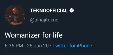 Popular Nigerian singer and producer, Augustine Mile Kelechi popularly known as Tekno, took to social media to reveal that he is a ‘Womanizer for life’.