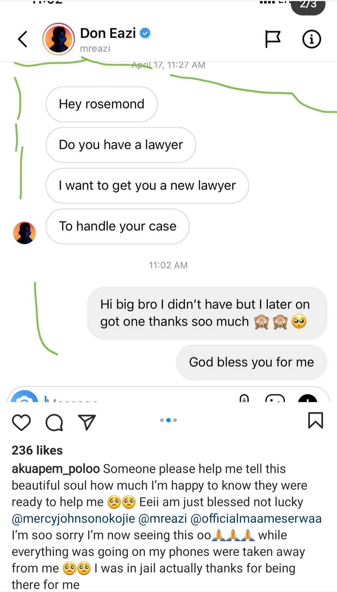 “Someone please help me tell this beautiful soul how much I’m happy to know they were ready to help me 🥺🥺 Eeii am just blessed not lucky @mercyjohnsonokojie @mreazi @officialmaameserwaa I’m soo sorry I’m now seeing this oo🙏🙏🙏 while everything was going on my phones were taken away from me 🥺🥺 I was in jail actually thanks for being there for me.”