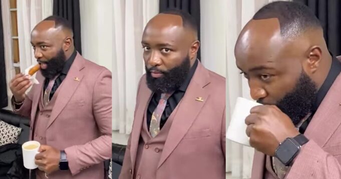 The widely spread video recorded the man in a double-breasted suit, cooling off with a meal after styling his hair.