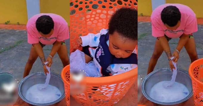 Nigerian woman in disbelief after her husband kept their toddler in check by placing the toddler inside the laundry basket as he did his laundry.