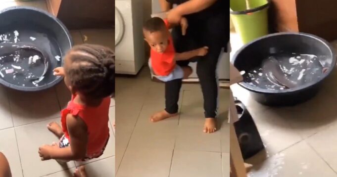 A lighthearted scene was captured in a video of two children, a little boy and a girl trying to play with a catfish.