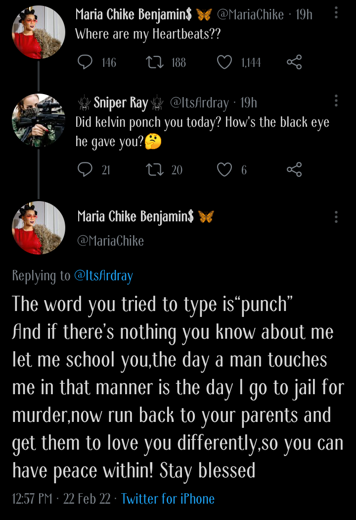 “The word you tried to type is “punch” And if there’s nothing you know about me let me school you,the day a man touches me in that manner is the day I go to jail for murder, now run back to your parents and get them to love you differently, so you can have peace within! Stay blessed”, she wrote.
